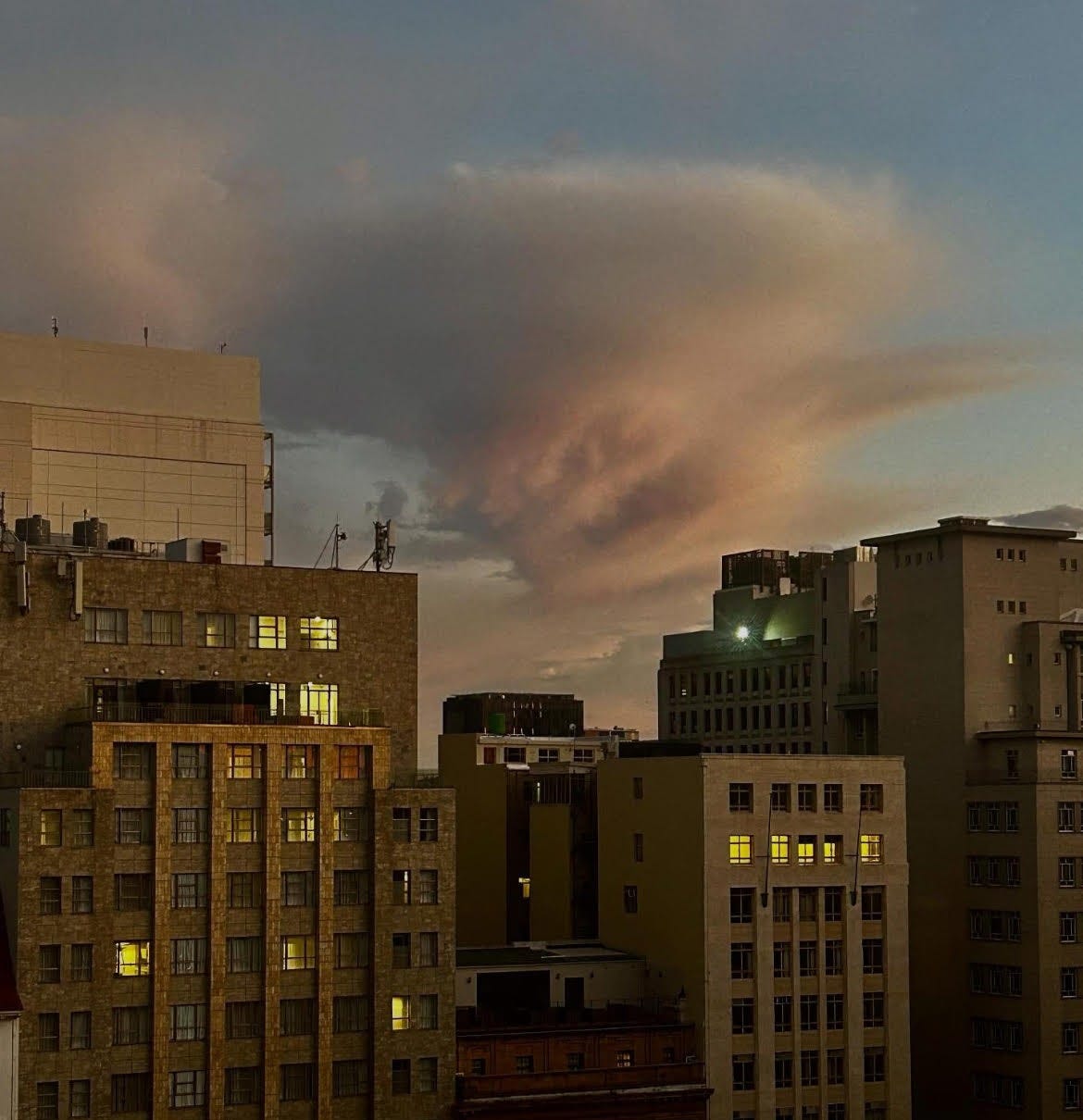 A few days ago while driving on a freeway at 120 km/h and thinking about a photograph I had taken of a cityscape over which loomed a cloud that—to my mind—looked like an atomic bomb mushroom I saw a man in a dressing gown and slippers hitchhiking on the side of the road. When my sister saw the picture and said it was a giant swan in flight. She is prone to a more whimsical pareidolia.