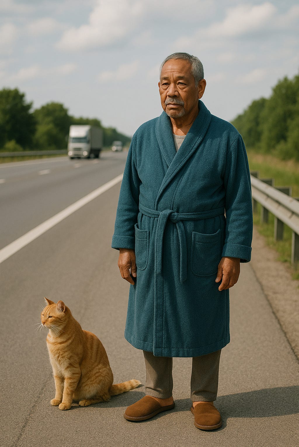 Now suddenly this cloudy musing was juxtapositioned with the questions: what sane man would walk out on a busy freeway around rush hour in a dressing gown? And what sane man driving in the fast lane would cut across traffic to stop and pick him up?